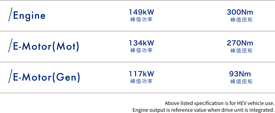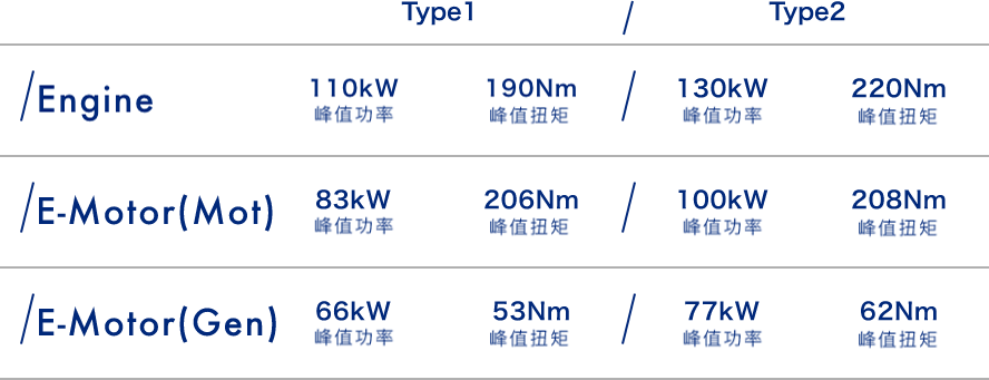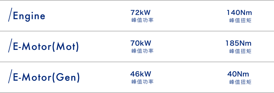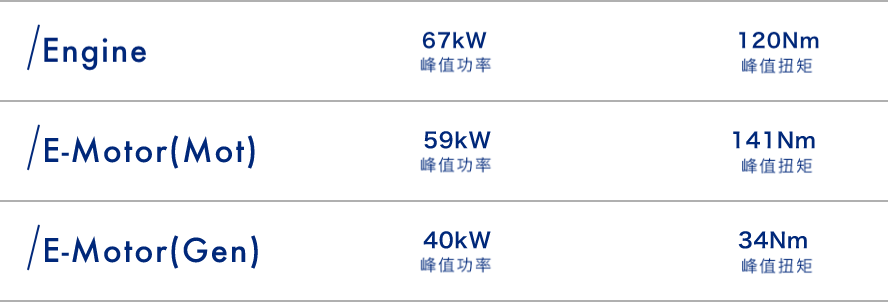 该混合动力系统配备汽油发动机和两个电动机(其中一个用于驱动行驶,另一个用于发电)。